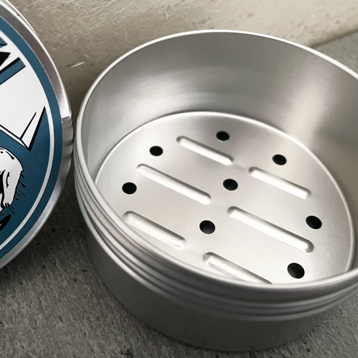 Runde Seifendose aus Aluminium mit Schraubdeckel und Abtropfschale